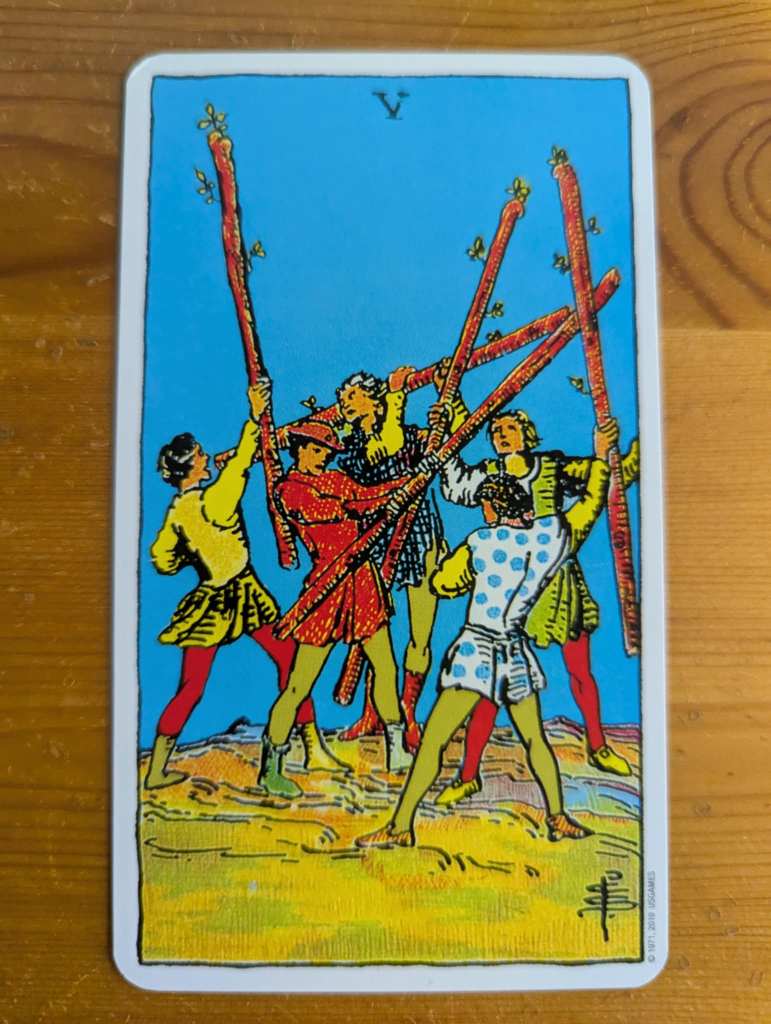 Before I made either of the two intentional draws I get into below, while I was shuffling for the first time a single card dropped from the deck and fell to the floor — the Five of Wands: