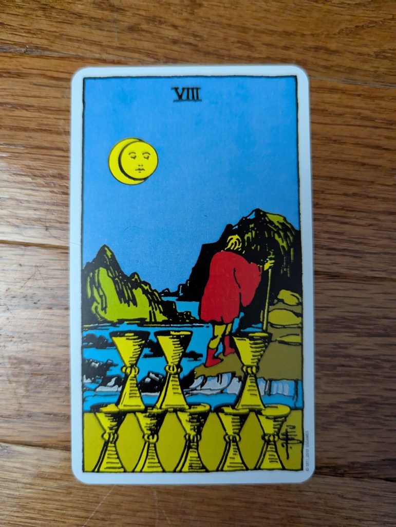 The above quoted paragraphs and the included image are the series of Bluesky “skeets” (posts) I made after drinking for three or four nights in a row. I was feeling very rough and like I needed to make a drastic decision regarding cutting out drinking completely. Then, I sat down, shuffled, and drew exactly one card, and it was the VIII of Cups.