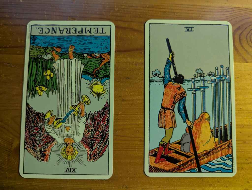 So the primary message from the left side of the duality, failure in Temperance, reinforces the message of the VIII of Cups to me that abstinence from self-destructive habits is key to how I fit into, if not making something of myself, making at least as best an effort as I can to try to fix things before we all sink. Moderation in less extreme comforts is reasonable and necessary as well. So it’s not the Google #1 or the Google #2 reading of that first card, it’s both.