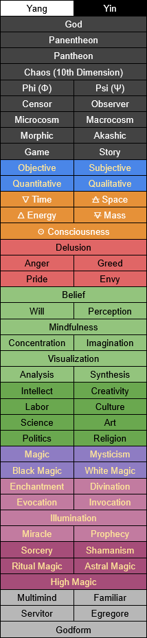 Furthermore, increased and improved objective and subjective quantity and quality of “knowledge and conversation” and commerce across the Microcosm-Macrocosm boundary of any given “Self” generates a lesser or greater Godform.